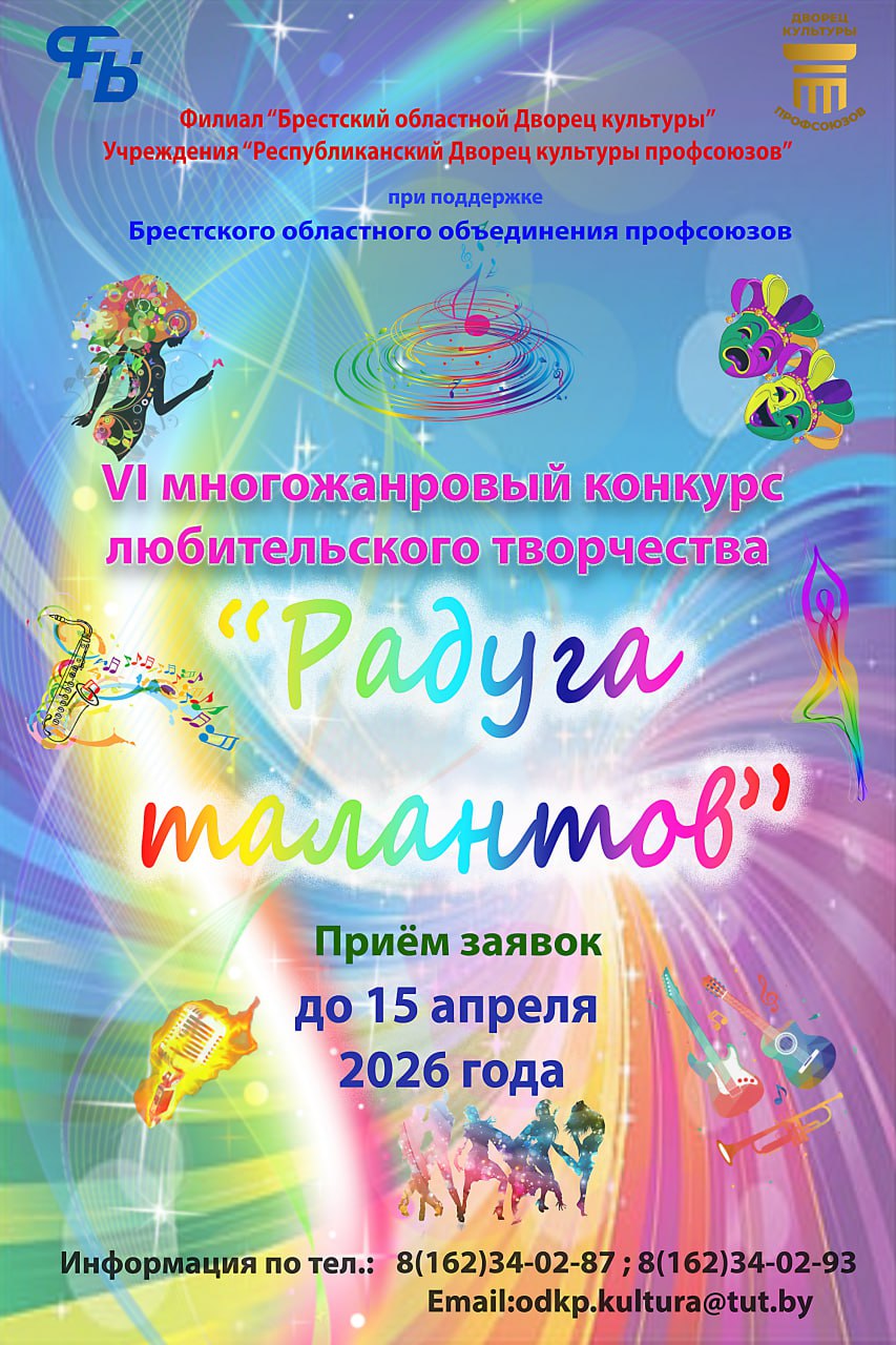 Филиал «Брестский областной Дворец культуры» Учреждения «Республиканский Дворец культуры профсоюзов» при поддержке  Брестского областного объединения профсоюзов объявляет о начале приёма заявок для участия в VI  многожанровом конкурсе любительского  художественного  творчества  «Радуга талантов».